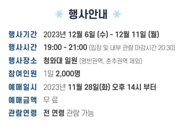 11월 28일(화)부터 청와대 누리집에서 무료 예매할 수 있습니다.